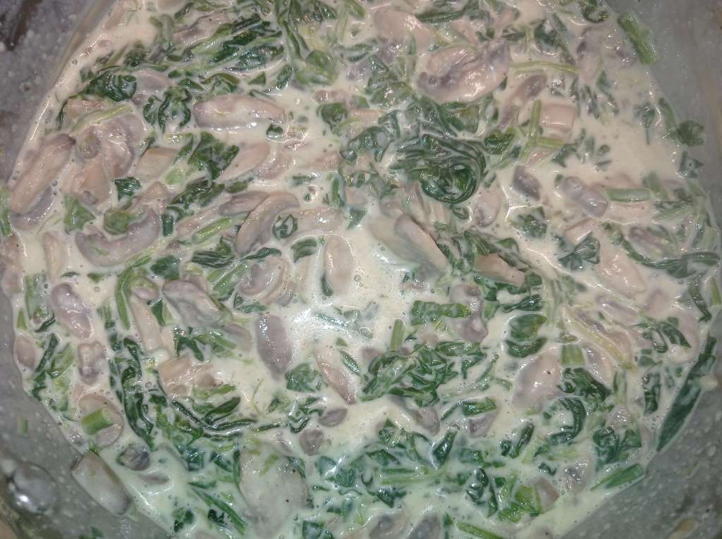 Pour this creamy mixture over the spinach and mushrooms in the pan. Let it come to a gentle boil for 1–2 minutes without a lid, stirring frequently until the sauce thickens slightly. Season with salt to taste.